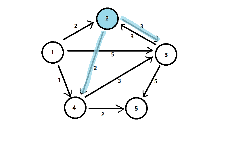 2번 노드를 거쳐서 3번과 4번 노드로 가는 최소 비용은 5 (2+3), 4 (2+2) 이다.