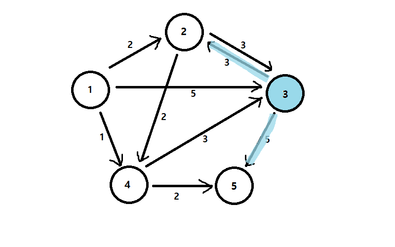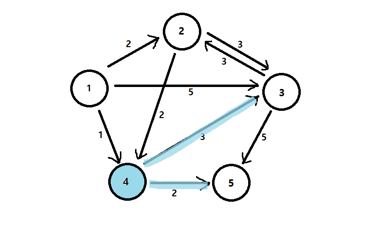 4번 노드를 거쳐서 3번과 5번 노드로 가는 최소 비용은 4 (1+3), 3 (1+2) 이다.
