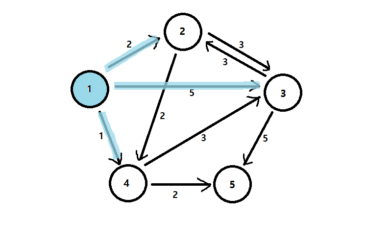 1번 노드를 거쳐서 2번, 3번, 4번으로 가는 최소 비용은 2 (0+2), 5 (0+5), 1 (0+1) 이다.