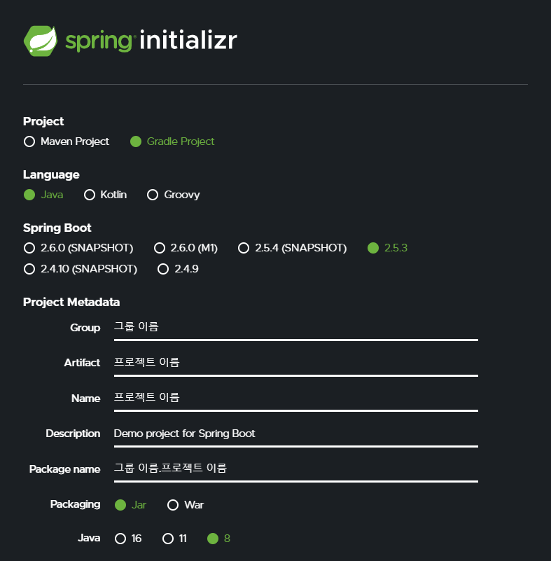 위의 사이트에서 Spring 프로젝트 폴더(*.zip)를 생성 및 다운로드할 수 있다.