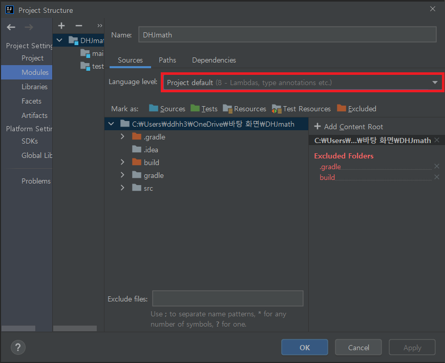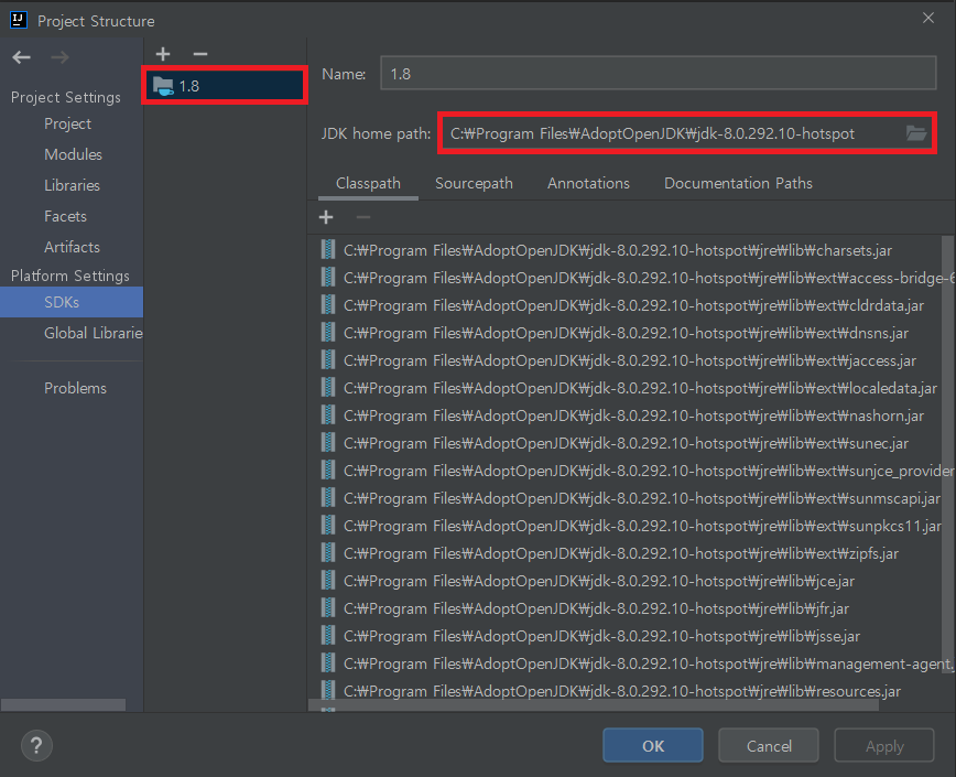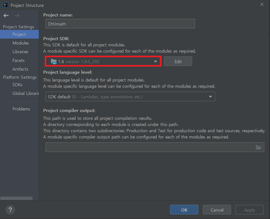 JDK 8 버전을 다운로드 했기 때문에 Java 도 8로 선택해준다.