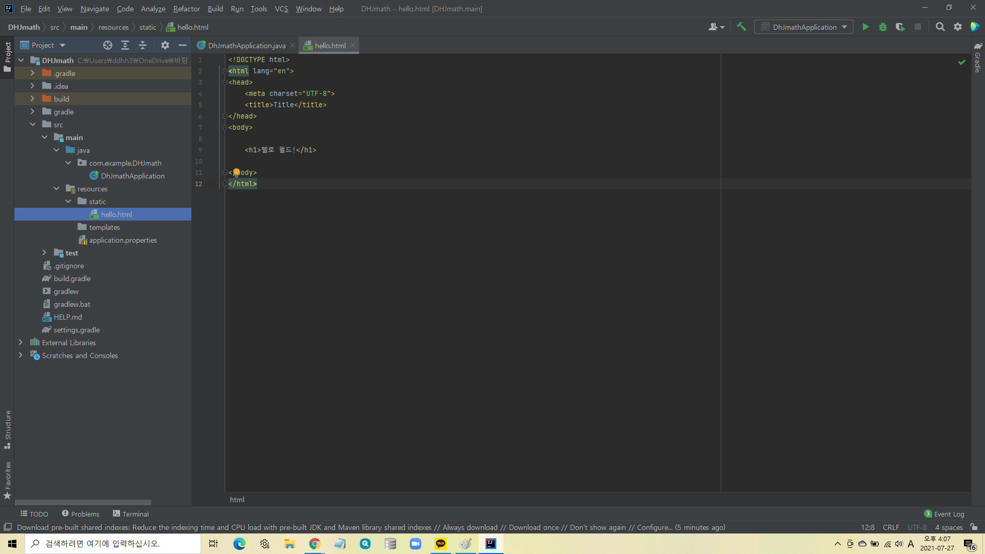 src/main/resources/static 에 hello.html 파일을 생성해보자.
