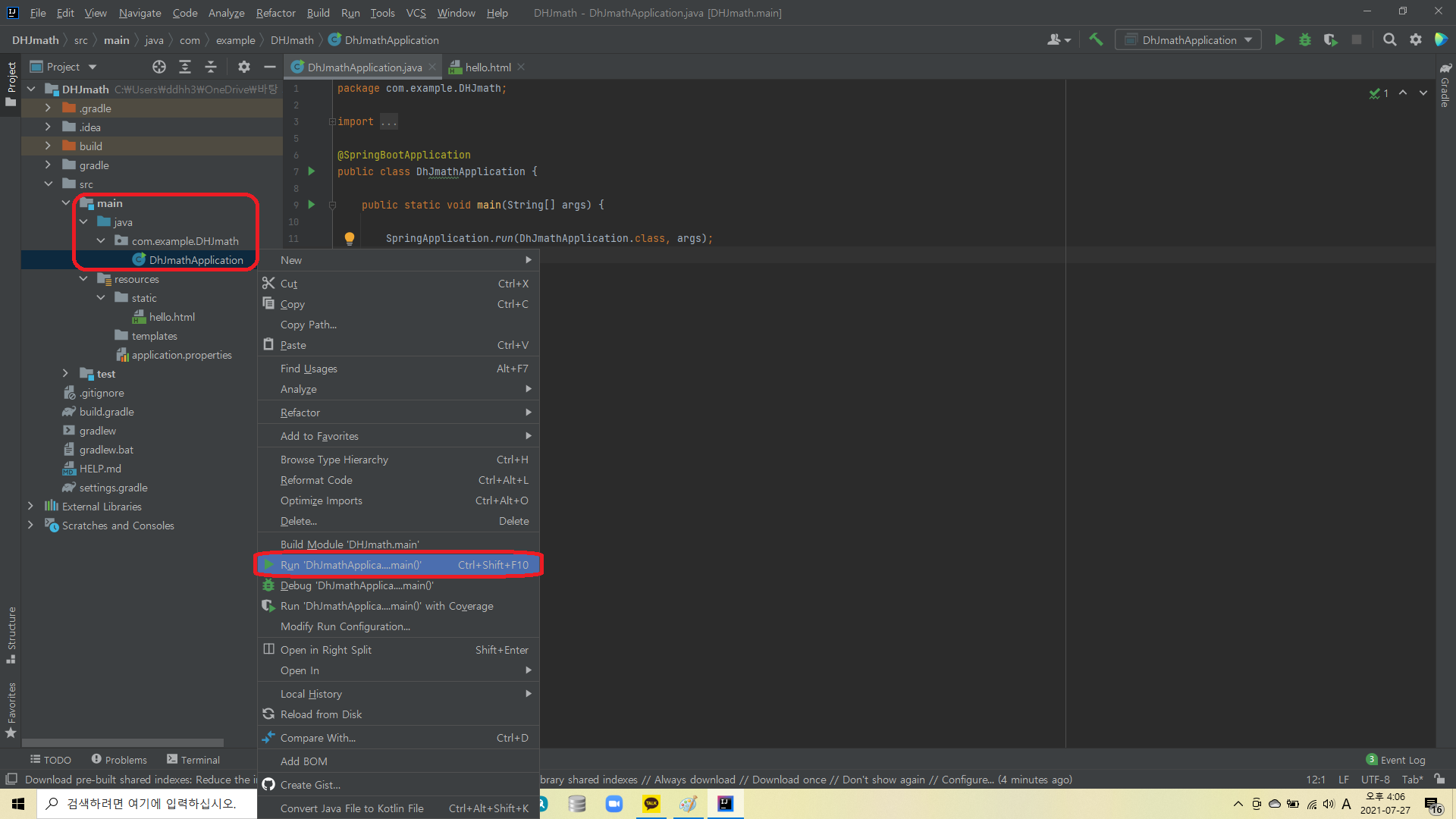 아래사진처럼 우클릭해서 혹은 ctrl+shift+f10 단축키로 프로젝트를 실행해보자.