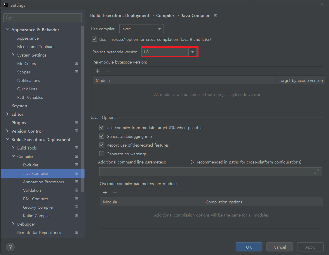 4. File > Settings > Build, Execution, Deployment > Compiler > Java Compiler