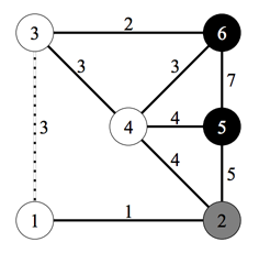 예제 입력의 두 번째 케이스를 시각화한 것이다. 이 듀오는 회색 원에서 두 검은 원 중 하나로 가고 있고 점선으로 표시된 도로에서 냄새를 맡았다. 따라서 그들은 6으로 향하고 있다.