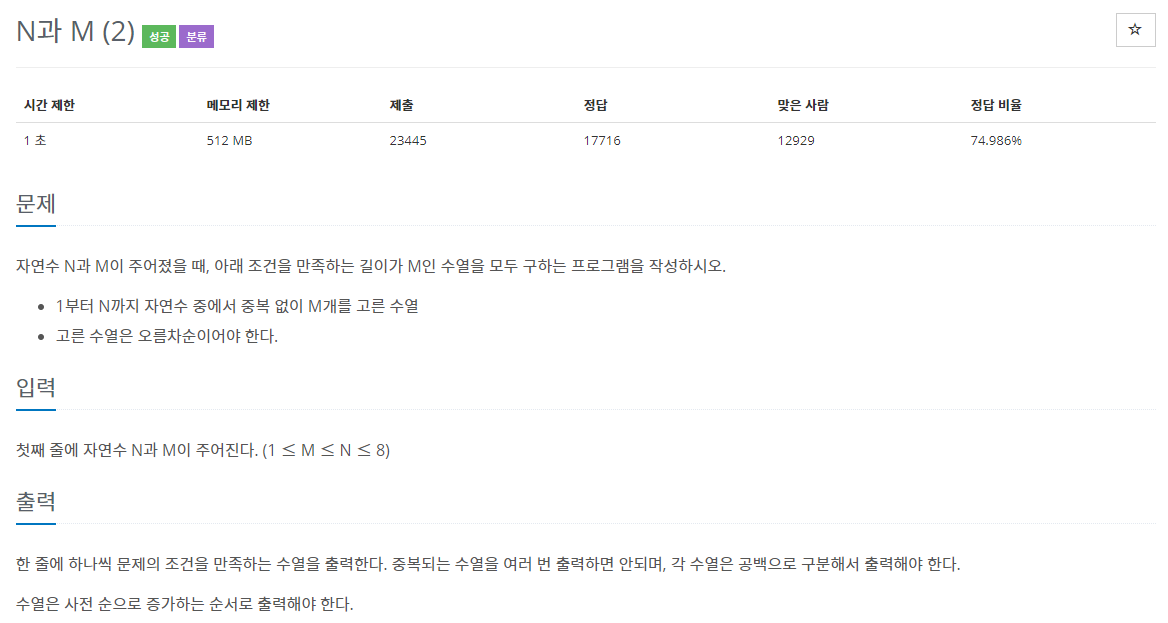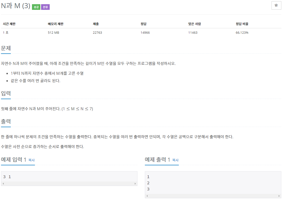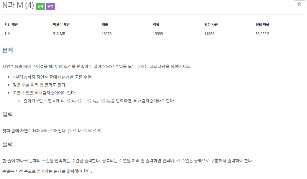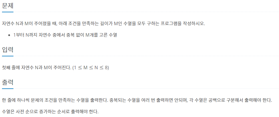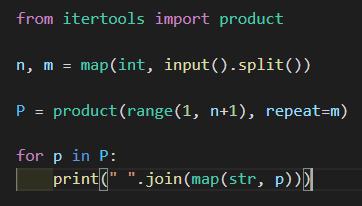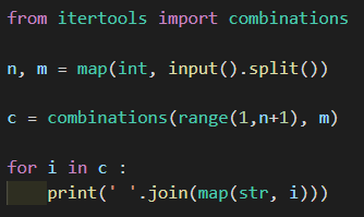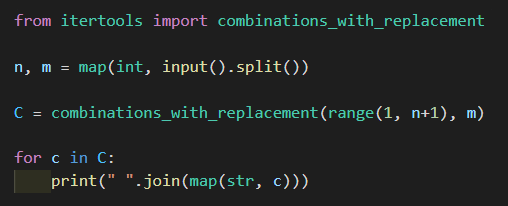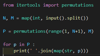 한 줄에 하나씩 문제의 조건을 만족하는 수열을 출력한다. 중복되는 수열을 여러 번 출력하면 안되며, 각 수열은 공백으로 구분해서 출력해야 한다. 수열은 사전 순으로 증가하는 순서로 출력해