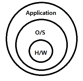 그 하드웨어를 제어하고 있는 것이 O/S(운영체제) 이고, O/S 바탕 위에 여러가지 application 프로그램들이 있다. application 프로그램들은 하드웨어 서비스를 받기 위해서(프린터나 디스크를 사용하기 위해서) 그림에서 보다시피 O/S가 중간에 있기 때문에 O/S에게 요청을 해야한다.