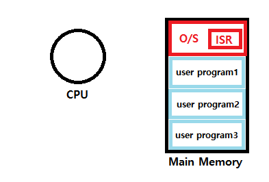 메인 메모리에는 O/S가 항상 상주해있고, 사용자 프로그램이 여러개 있다. (멀티 프로그래밍/ 타임 쉐어링 시스템)