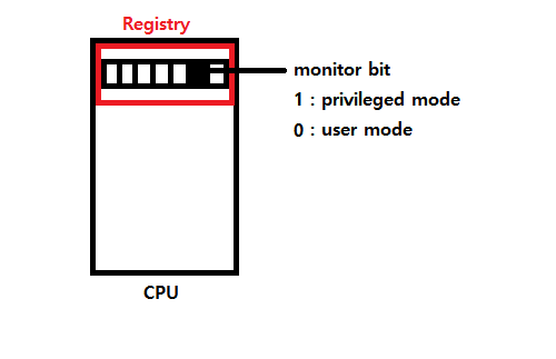 CPU 안에 레지스트리(Registry) 영역에 monitor bit(flag)를 할당하여 모드 정보를 저장한다.
