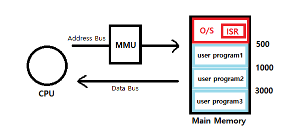 예를 들어 user program1의 메모리 주소가 500-1000 사이이면, user1이 메모리에 접근할 때에는 CPU가 500-1000사이의 주소를 전송했을 때만 MMU가 통과시켜 주는 것이다. 만약 user1이 CPU를 사용중인데, 메모리 주소 3000을 전송하면, 다른 유저의 메모리 주소이므로 MMU가 메모리 접근을 차단해버린다.