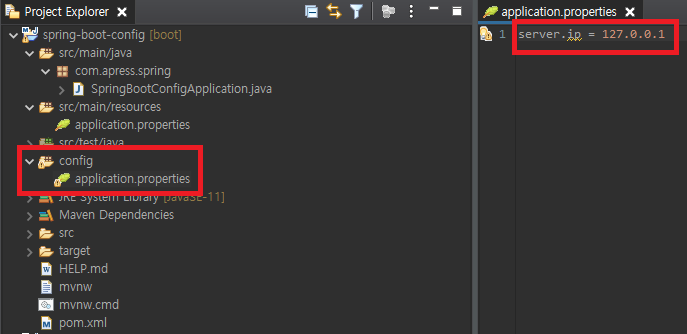 ② 있다면, 현재 폴더 밑에 /config 폴더를 만들고 application.properties 파일을 새로 추가하고, server.ip = 127.0.0.1로 설정해준다.