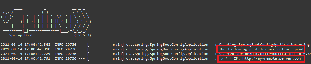 The following profiles are active: prod 에서 액티브 프로파일이 prod이고, 따라서 application-prod.properties 파일의 프로퍼티 값으로 '> 서버 IP: http://my-remote.server.com이 이 출력된다.
