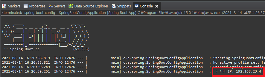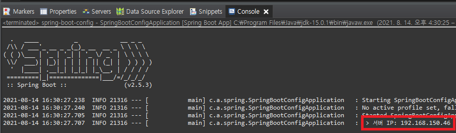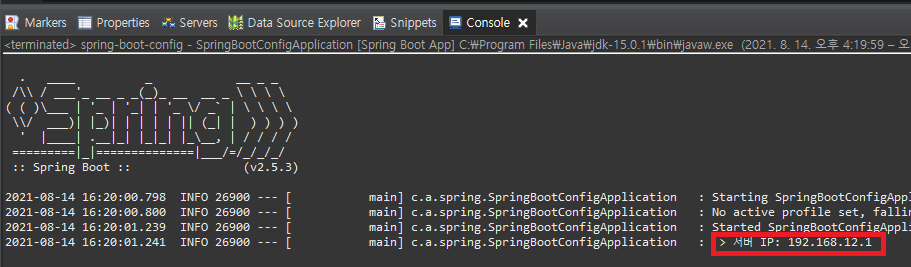 $ ./mvnw package -DskipTests = true $ java -jar target/spring-boot-config-0.0.1-SNAPSHOT.jar --server.ip = 192.168.12.1