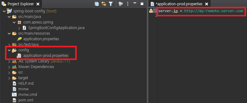 ① 하위폴더 /config에 application-prod.properties 파일을 만들고 그 안에 server.ip=http://my-remote.server.com 를 작성한다.