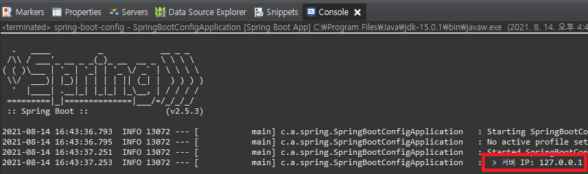 - /config/application.properties 파일에는 server.ip가 127.0.0.1로 설정되어 있는 상태이다.